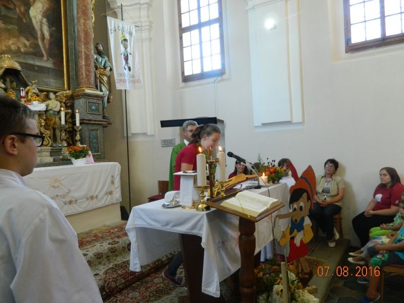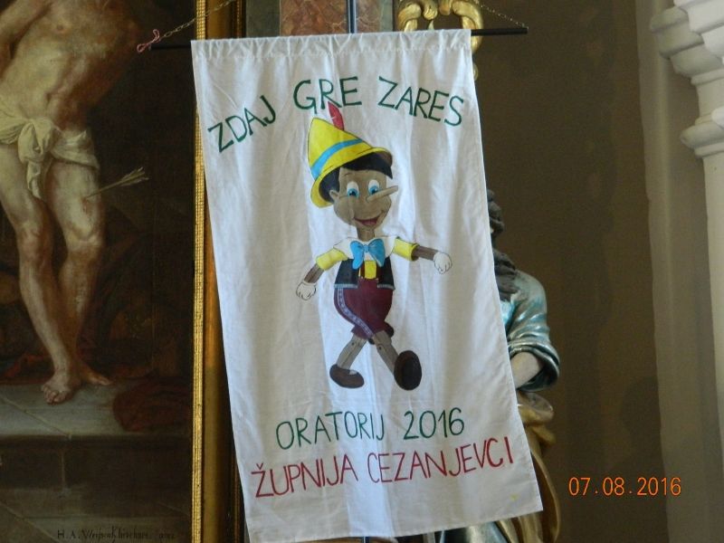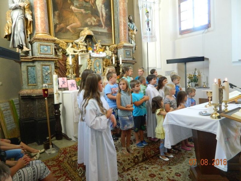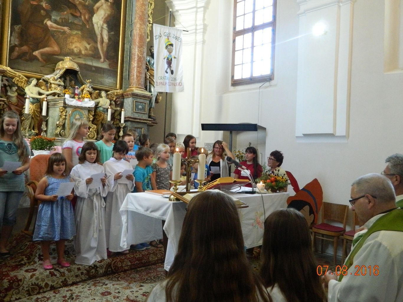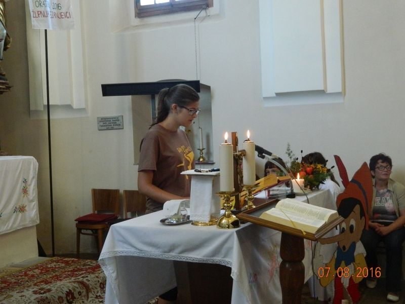 Mašo je vodil misijonar gospod župnik Janez Ferencek iz Apač, ki nas je pred pridigo presenetil in nam zapel pesem ob igranju kitare. Po poučni pridigi so se predstavili še otroci s svojimi vtisi iz oratorija in povedali, da so se imeli na oratoriju lepo in da so jih najbolj zabavale vodne igre. Udeleženci oratorija ter animatorji so sodelovali pri branju beril in prošenj. Med mašo so peli pesmi, na koncu svete maše pa so zapeli še letošnjo oratorijsko himno? Zdaj gre zares?. Po končani sveti maši so animatorji otrokom razdelili njihove izdelke, ki so jih izdelali na delavnicah v času oratorija. S to sveto mašo smo v naši župniji zaključili že četrti oratorij.